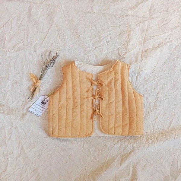 Confeccionado en Lienzo (intervenido con tintes naturales) + Guata con costuras rectas. Espalda bordada con el Motivo "Montañitas" con tecnica de Bordado en aplique, utilizando retacitos de otras prendas naturales.